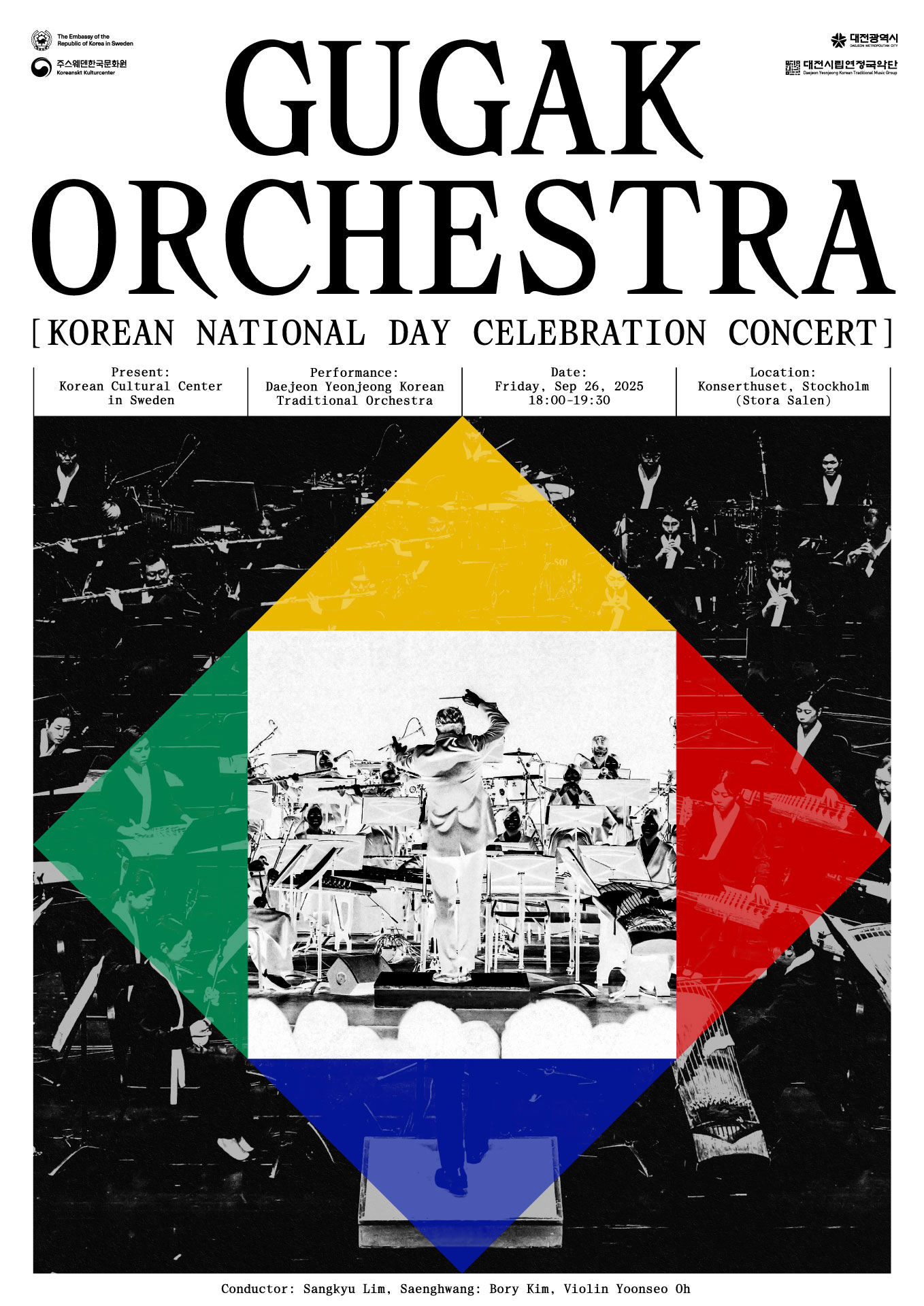 The Korean Cultural Center in Sweden is delighted to announce a special concert, "Gugak Orchestra" held to commemorate Korea's National Day. This unique performance will showcase the rich tapestry of Korean traditional music (Gugak) in a captivating blend with Western orchestral elements, promising an unforgettable cultural experience for all attendees.